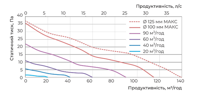 Модель обладнана такими датчиками: датчик вологості, датчик руху, датчик світла та температури та таймери. Вентилятор здатний видаляти повітря з максимальною продуктивністю до 140 м3/год і має 5 швидкостей. Може бути обладнаний патрубком 100 або 125 мм (патрубки входять до комплекту) або змонтовані на витяжний отвір шахти до поверхні стіни.